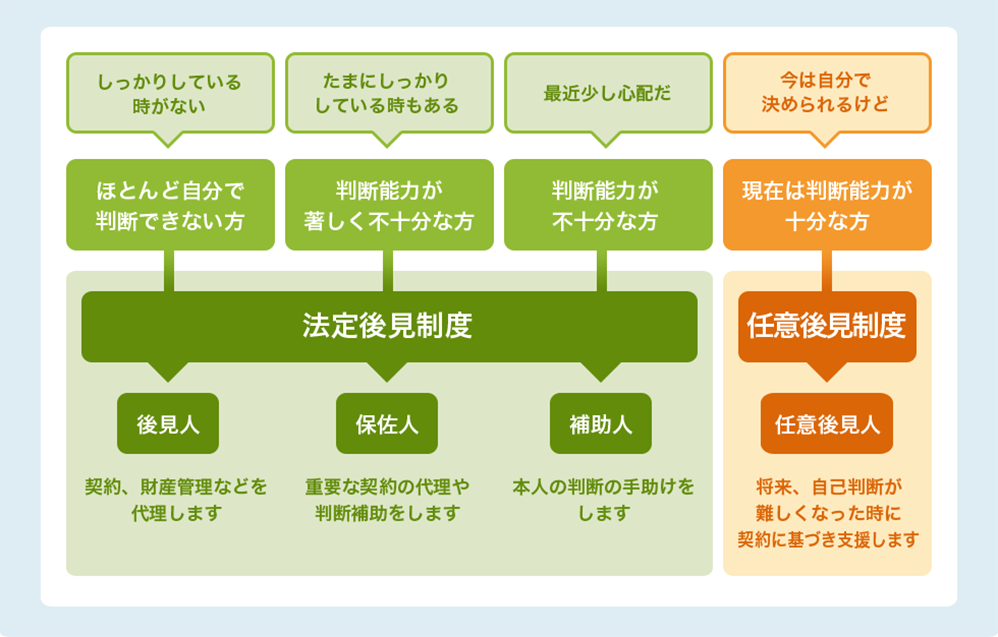 成年後見制度は、認知症や精神障がい、知的障がいなどによって判断能力が十分でない方の財産や権利を損なわないために、後見人が本人に代わってこれを管理し、介護サービスや施設入所の契約、入所手続きなどを行い本人をサポートするものです。