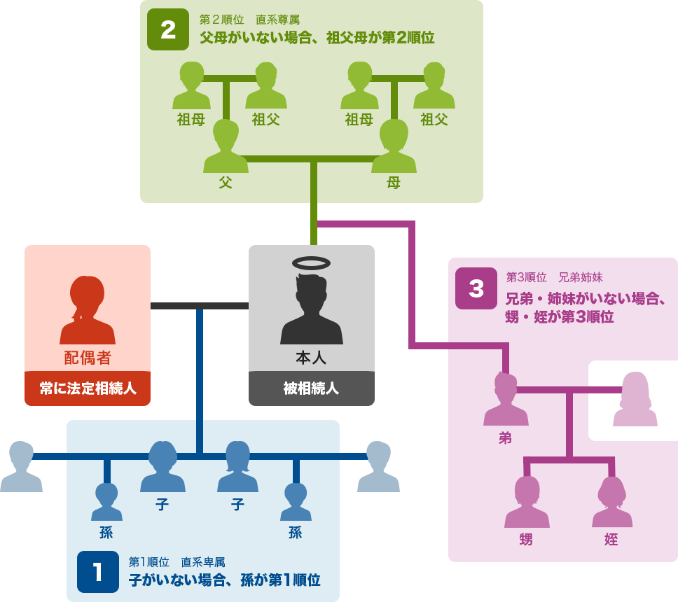 同じ順位の人が複数いる場合は、全員が相続人となります。また、先順位の人が1人でもいる場合は、後順位の人は相続人になれません。